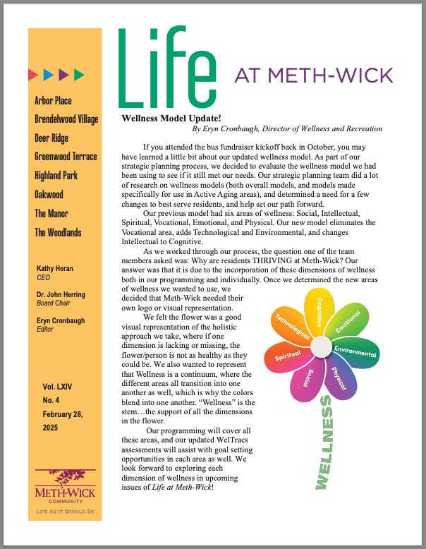 During the past year we also implemented a new Wellness Model and are about to roll out new Successful Aging software, reinforcing Meth-Wick’s commitment to being a dynamic, active aging community. Finding ways to advance our use of technology was also a focus in 2025 and will continue into the new year.