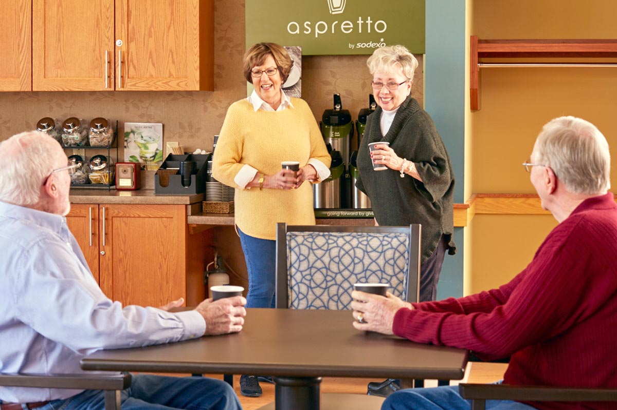 This 14,000-square-foot expansion and renovation project was completed in 2011 to enhance the lives of Meth-Wick residents. A beautiful outdoor courtyard with flowers and waterfalls is a popular hangout during warmer months. Town Center features include: